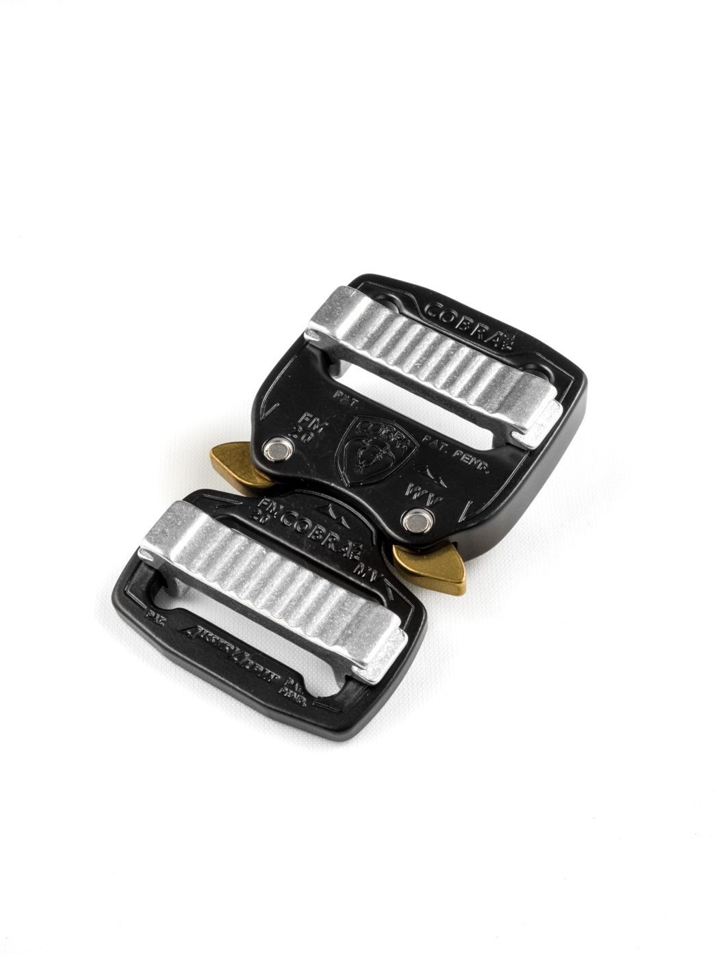 Das Gurtband kann auf beiden Seiten mit einem variablen Steg fixiert und in der Länge verstellt werden. Der Cobra FM Blitzverschluss lässt sich weder einseitig noch unter Last öffnen.
