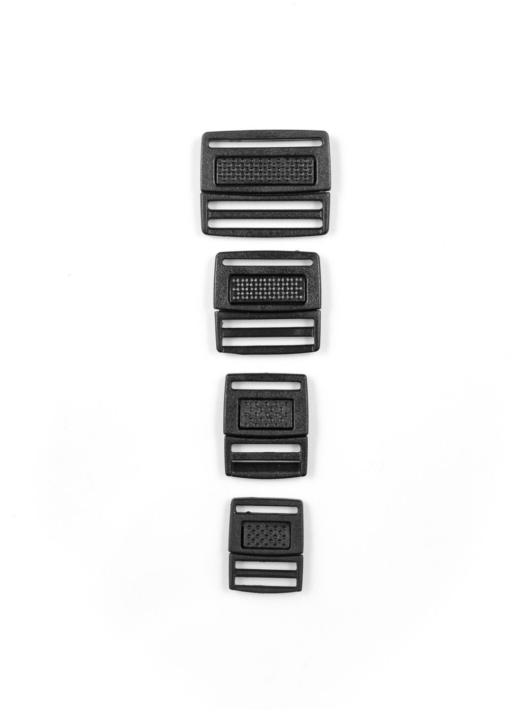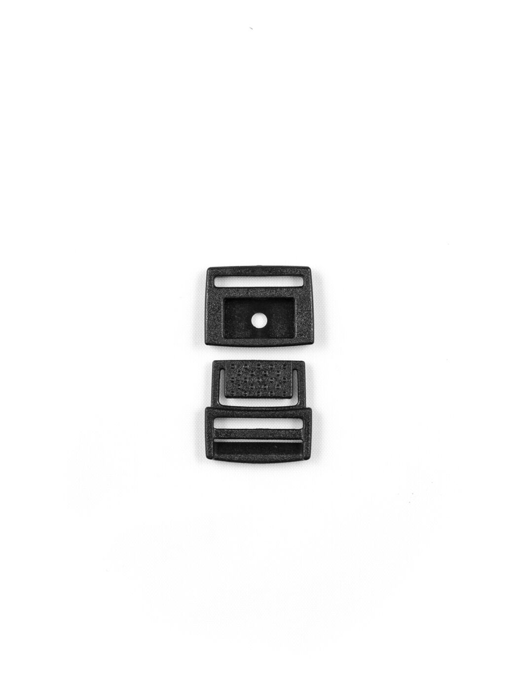 Extra slim center release buckle for 15mm wide webbing. With "centre-push" mechanism where the buckle is opened by pressing on the flat buckle. Amazingly durbale despite the filigree construction. Also called "wafer clip". The webbing must be looped and sewn on the female part and cannot be adjusted in length. On the male part, the webbing can be threaded and can still be adjusted in length. Ideal for our normal webbing or elastic straps. Grossgrain ribbon is too thin and slips through the buckle.