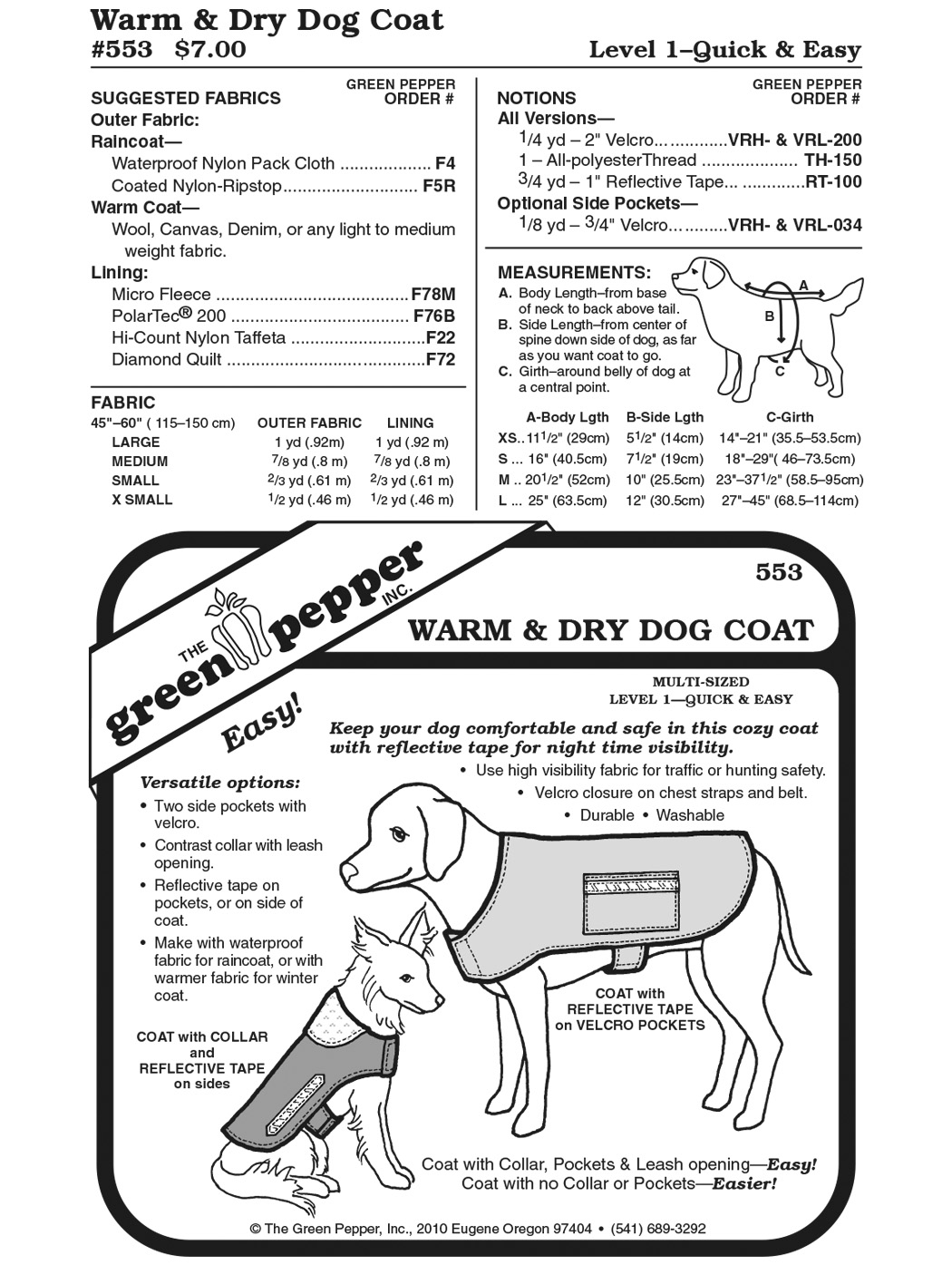 Pattern for a waterproof and warming dog coat with pockets and reflective tape.