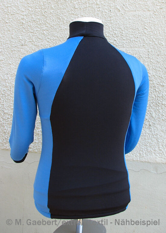 As the temperatures have dropped Sina has sewn a warm baselayer after a Jalie pattern. A merino / spandex / nylon Techfit jersey was used, which warms particularly well due to the loopy inside and is much more stable than 100% merino jersey due to the nylon outside. Since it is pulled up on a men's tailor mannequin, it looks a bit misshapen.