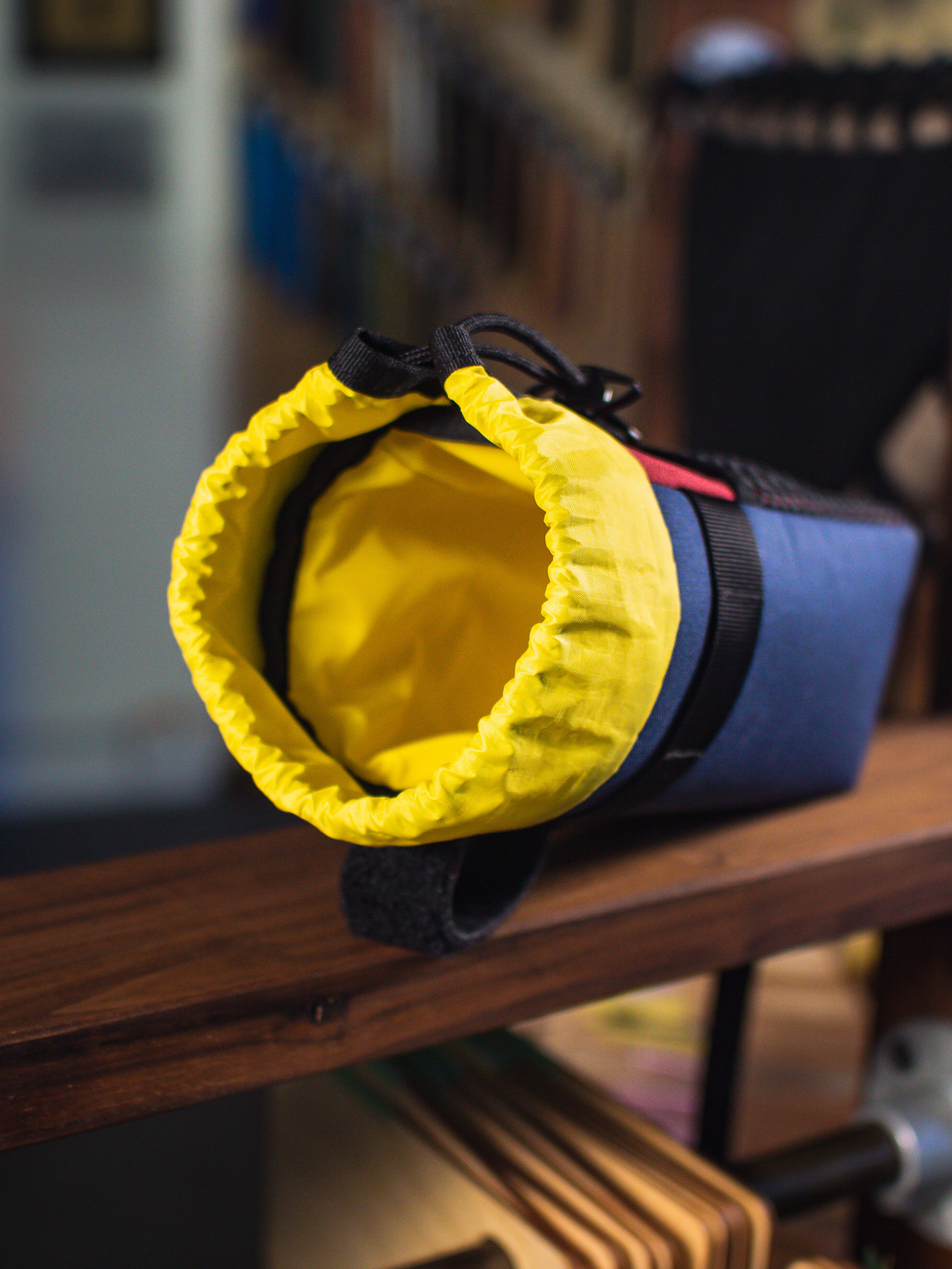 Of course, the snack pack actually belongs on the handlebars of a bicycle. As a showpiece, however, it's more about the choice of material than the perfect placement: our 500den strong, coated Cordura® is used as the outer material. The PU-coated 210den nylon was used for the upper, yellow collar and the lining. Thanks to the multi-layer construction of the outer fabrics Soft and Stable® foam padding and the nylon lining, the bag has a pleasantly firm grip and a certain amount of stability. Thanks to the lining, the contents are protected from bumps and damage. In the small attached front pocket, snacks and small utensils are always at hand. Direct links to the products used can also be found at the bottom of this page.