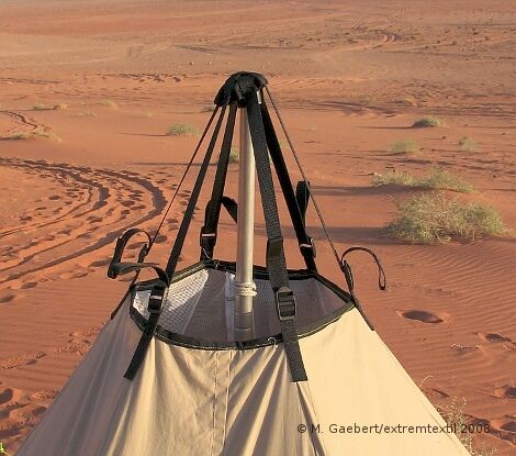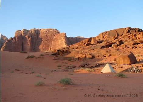 For 3 weeks in Jordan at 30-40 degrees and blazing sun, we sewed a tipi version from the cotton tent fabric, as a tent made of cotton heats up significantly less than a tent made of synthetic fibre. The advantages far outweigh the relatively high weight of 3.5 kilos (without poles and pegs). On the tour we decided against the tarp, because a closed construction protects much better from sand, wind and gives more privacy.