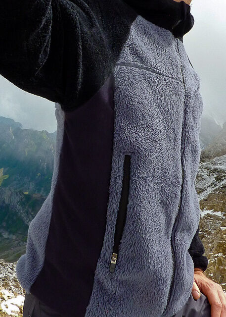A very warm fleece jacket made of the fur fleece with a lot of loft by Malden Mills, the fleece with the best warmth to weight ratio in the range. Since it is not windproof, a windshirt makes a great addition to it. Sewn from Green-Pepper's Fairbanks pattern, but with some adjustments (different hood, altered collar, tighter cut).
