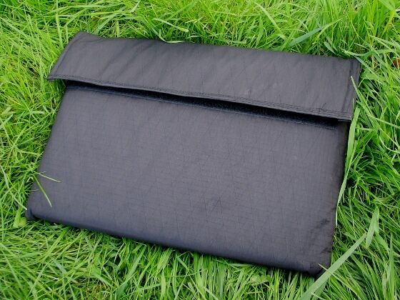 Surprisingly simple sewn, padded laptop bag with Velcro fastening. The piece was finished within half an hour. I used the lightweight X-Pac 07 as the outer material, the lining made of 3mm thick 3D mesh fabric protects the laptop from shocks. The bag weighs just 130g with a size of 35x24cm.