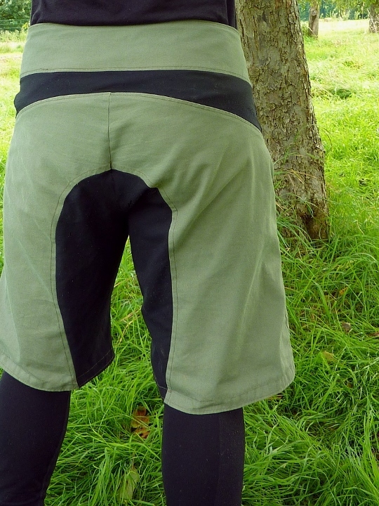 These shorts made from a thyme-coloured cotton/polyester blend are particularly adaptable thanks to the black inserts made from stretch polyamide with Coolmax. Sina took the cut from a pair of jeans. However, it was reworked several times before it became the trousers.