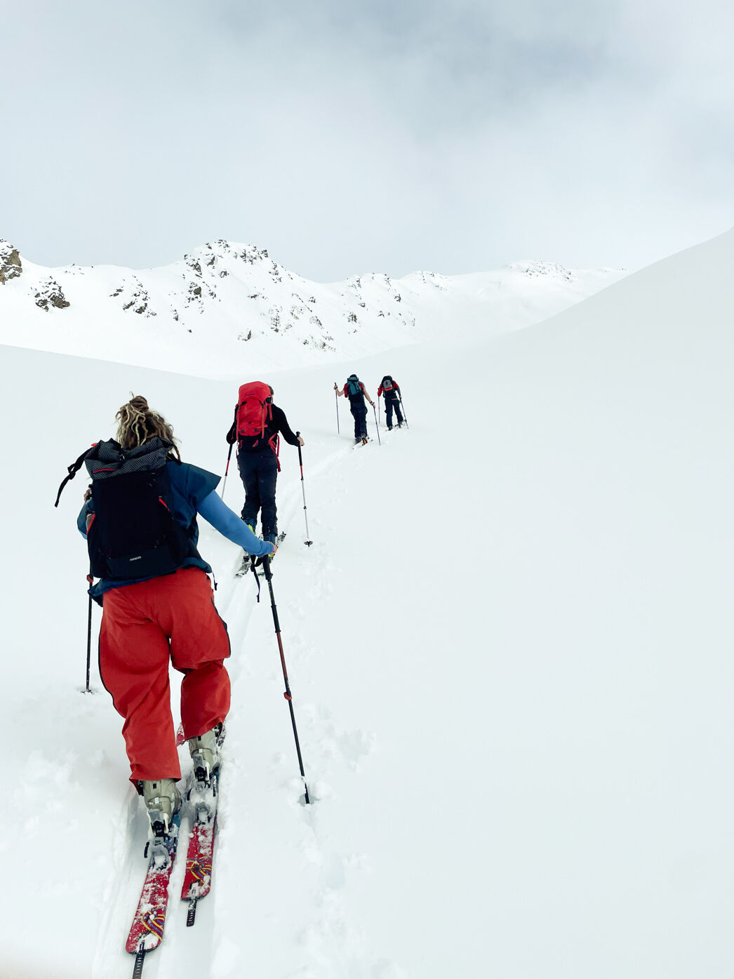 For these ski pants from the 3-layer laminate, PTFE membrane, soft&elastic Sina has taken off her old Burton snowboard pants. It took a lot of measuring, estimating and sewing, but then it fit amazingly well. The pants and the material have already proven themselves on many ski tours: very breathable, elastic and slightly warming due to the roughened lining.