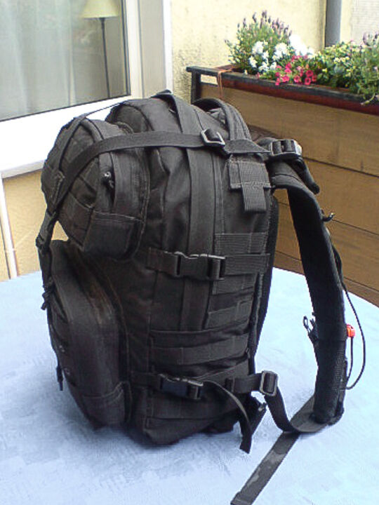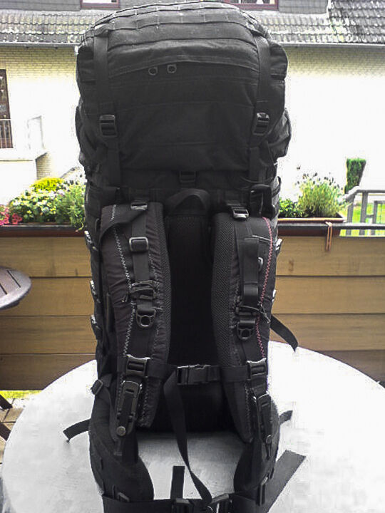 Now to the backpack itself. As fabric I used coated 1000'er Cordura, webbing made of nylon. The backpack has an internal aluminum carrying frame and removable hip and shoulder straps. The daypack can be strapped onto the large backpack.