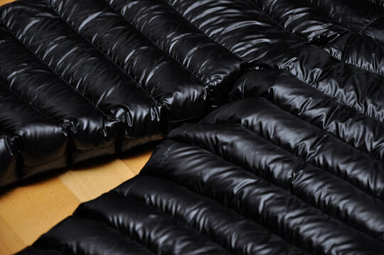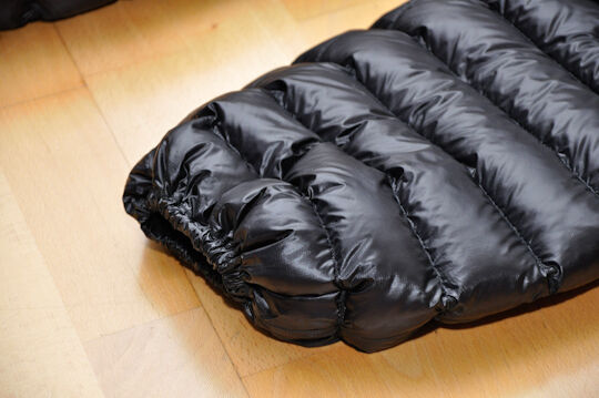 The cost for this was about 120,-€ in total. As a basis I took the pattern of a pair of jogging pants from Burda. Of course I had to change the cut a bit. Since I need the pant legs a bit longer anyway, I lengthened the pattern by 5cm according to the instructions and then by an additional 10cm to compensate for the shortening of the final length of the pants by bulking up the down chambers. I did not change the waist and leg width of the cut and simply chose my size based on the chart, since the cut is rather wide by design and the pants should fit tighter after down filling, since they are meant to be worn under a hardshell. I simply omitted the pants pockets included in the cut. After I then transferred the pattern pieces plus seam allowance to the fabric and cut them out, I had basically made two pairs of pants that I sewed together at the inner leg seams, the center seam at the crotch, and the back. The outer leg seams still remained open. Then, I ironed the seam allowance apart and left-side tacked the pants to each other. After that, taking into account the allowance for the hems, starting from the leg ends, I drew the down chambers at a distance of about 10cm. Now I could topstitch the chambers leaving the double seam allowance open towards the side seams. I then chose the visually nicer side as the right side and turned it inwards. Now I could baste the side seams of the "right" trouser parts and sew them together, paying attention to the seam allowance. The "left" sides had to remain open for the later down filling, of course. Then I ironed the seam allowance flat and fixed it with a glue stick. Now I could finally proceed to the down filling. For this I filled 1L breakfast bags, in the number of down chambers (36), by eye in equal parts with down. By means of a rolled up firm paper, which I put one after the other into the individual down chambers, and a long round wood I could fill these with the single portions. After filling, I was able to topstitch the side seams of the "left" trouser parts. Now I serged the seam allowance with a zigzag stitch and folded it flat along the side seam towards the back of the pants. Then I had to topstitch the down chambers along the side seam, parallel to each other, about 3cm open and thus also fixed the seam allowance neatly looking. Now that the down chambers were finished, I put the pants with several tennis balls in the dryer, so that the down in the surrounding chambers distributed evenly. Finally, all I had to do was make the hems and waistband according to the instructions and tuck in the elastic. The result is more than satisfactory - at 200g, the homemade pants are only 15g heavier than the WM Flash Pant, but are filled with twice the amount of down and are also suitable for big boys!