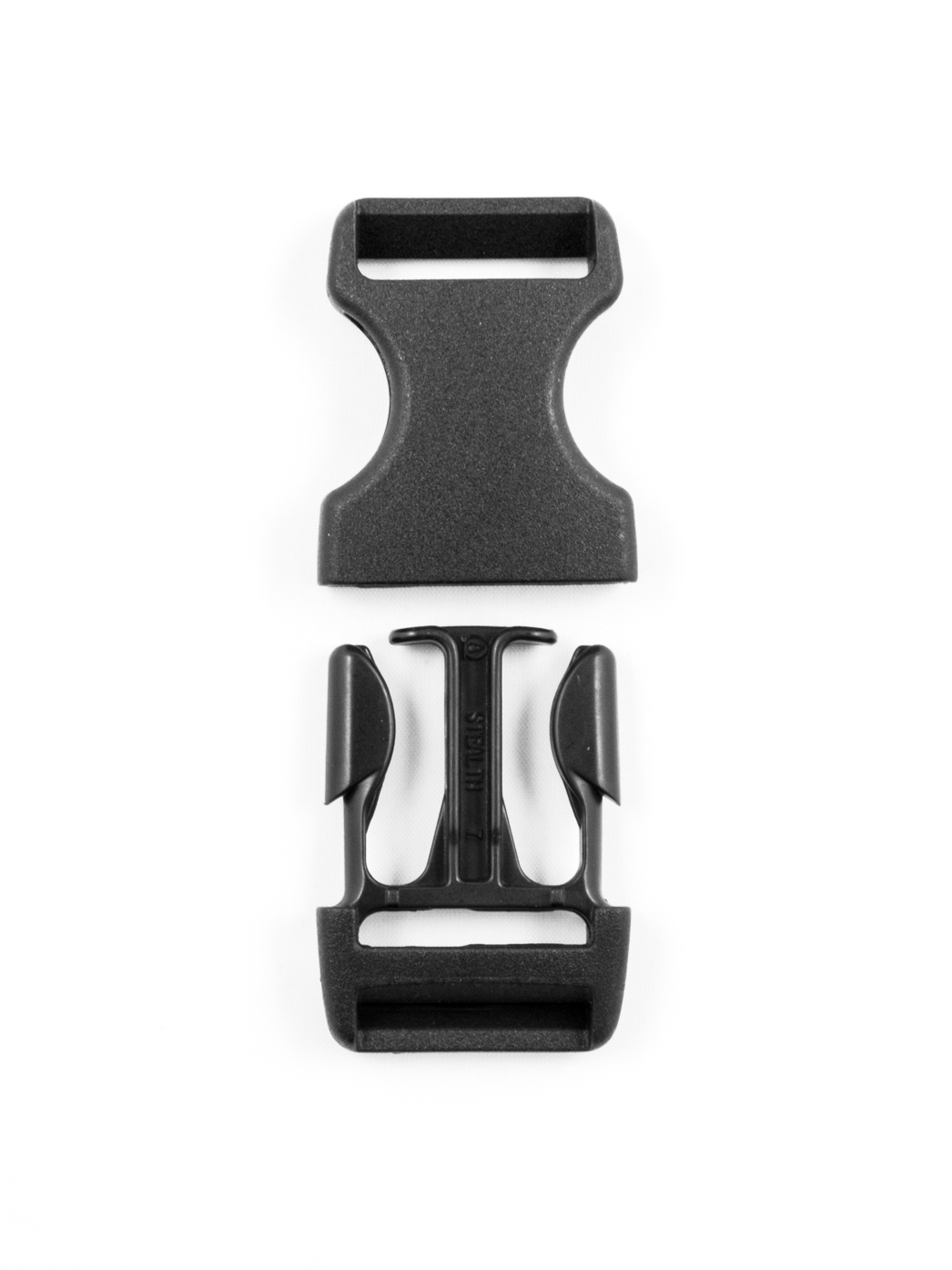 Quick release buckle for threading on one side for 25 mm wide webbing. 'For threading on one side' means that the webbing width must be sewn onto the female part after threading and that the length can no longer be adjusted. On the male part, the webbing width is threaded and can still be adjusted in length. This Stealth buckle is used on many rucksacks and bags and is also compatible with the other 25mm Stealth buckles.