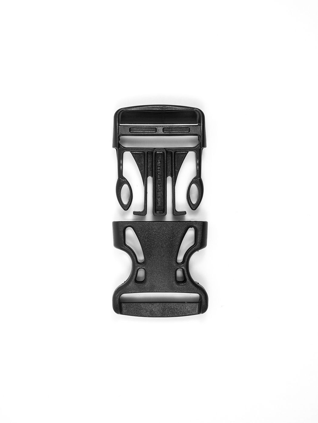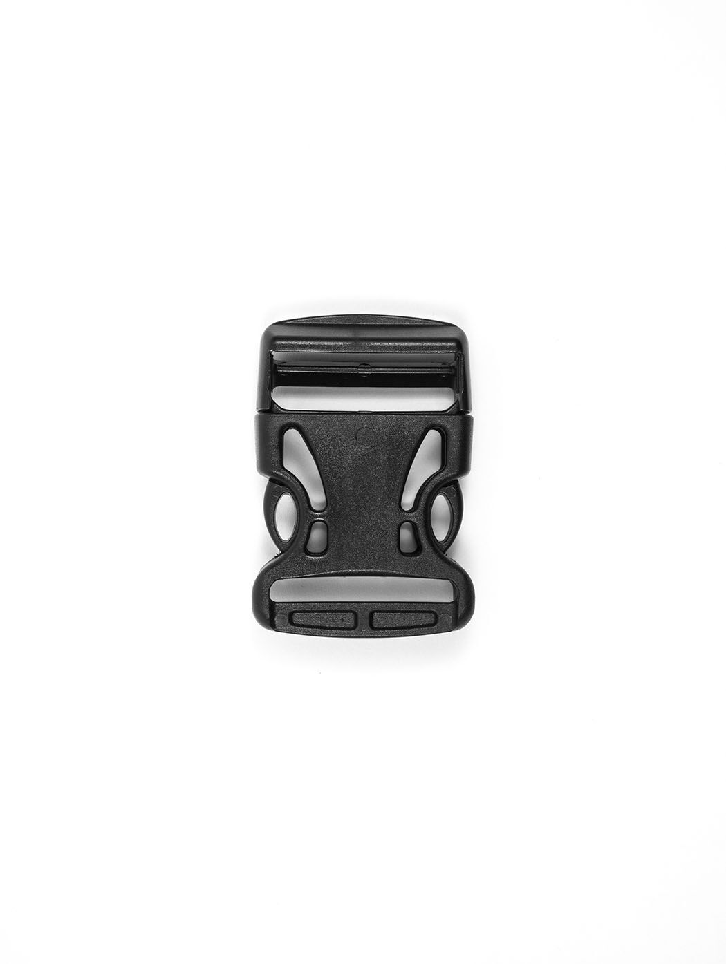 The "airy" version of the side release buckle. The design gives the buckle a futuristic look, the properties stay the same like with the regular side release buckle: This buckle can be looped at the male part and at the female part the webbing has to be sewn to be attached. The addition of a center support rib makes it very crush resistant. Contoured profile to improve user comfort.