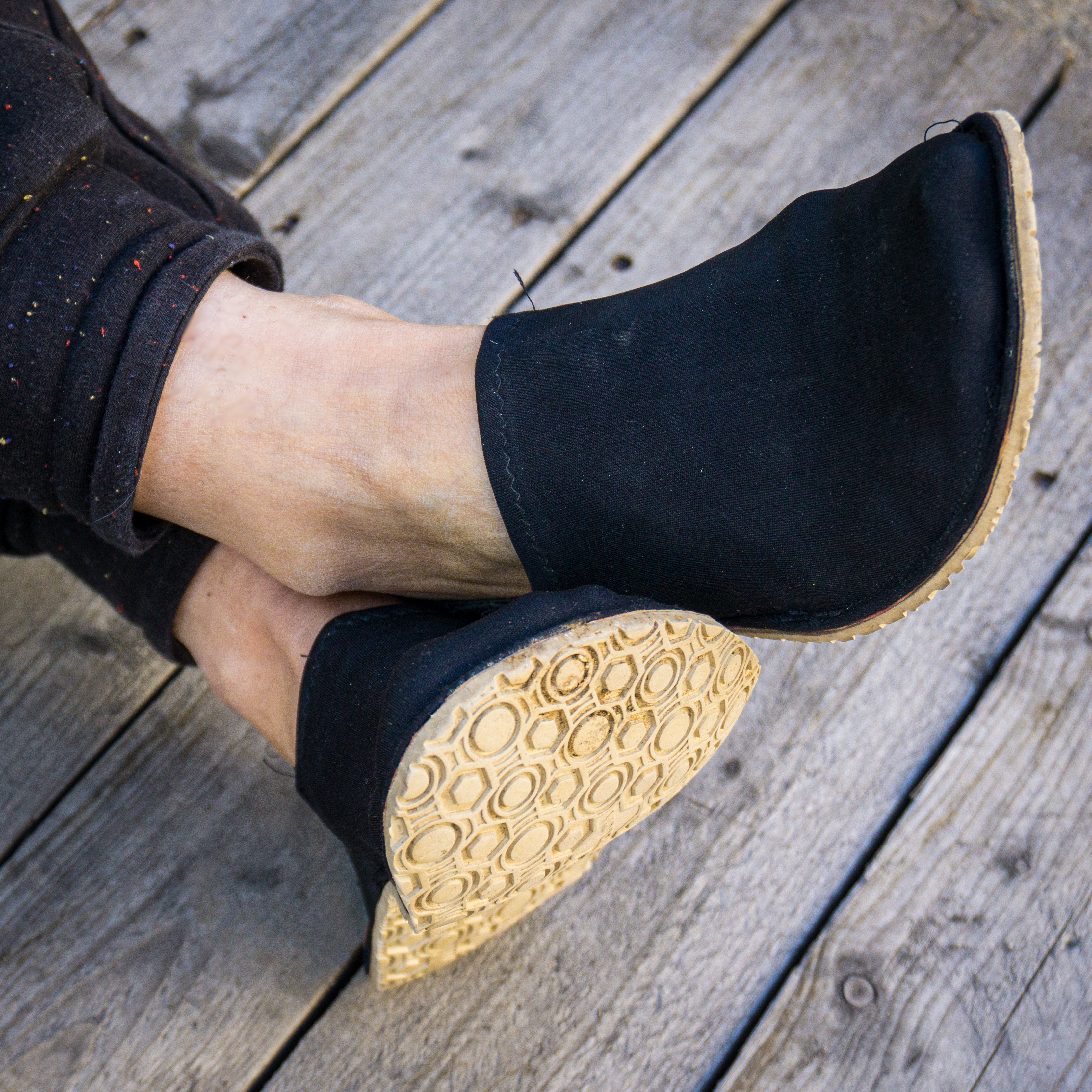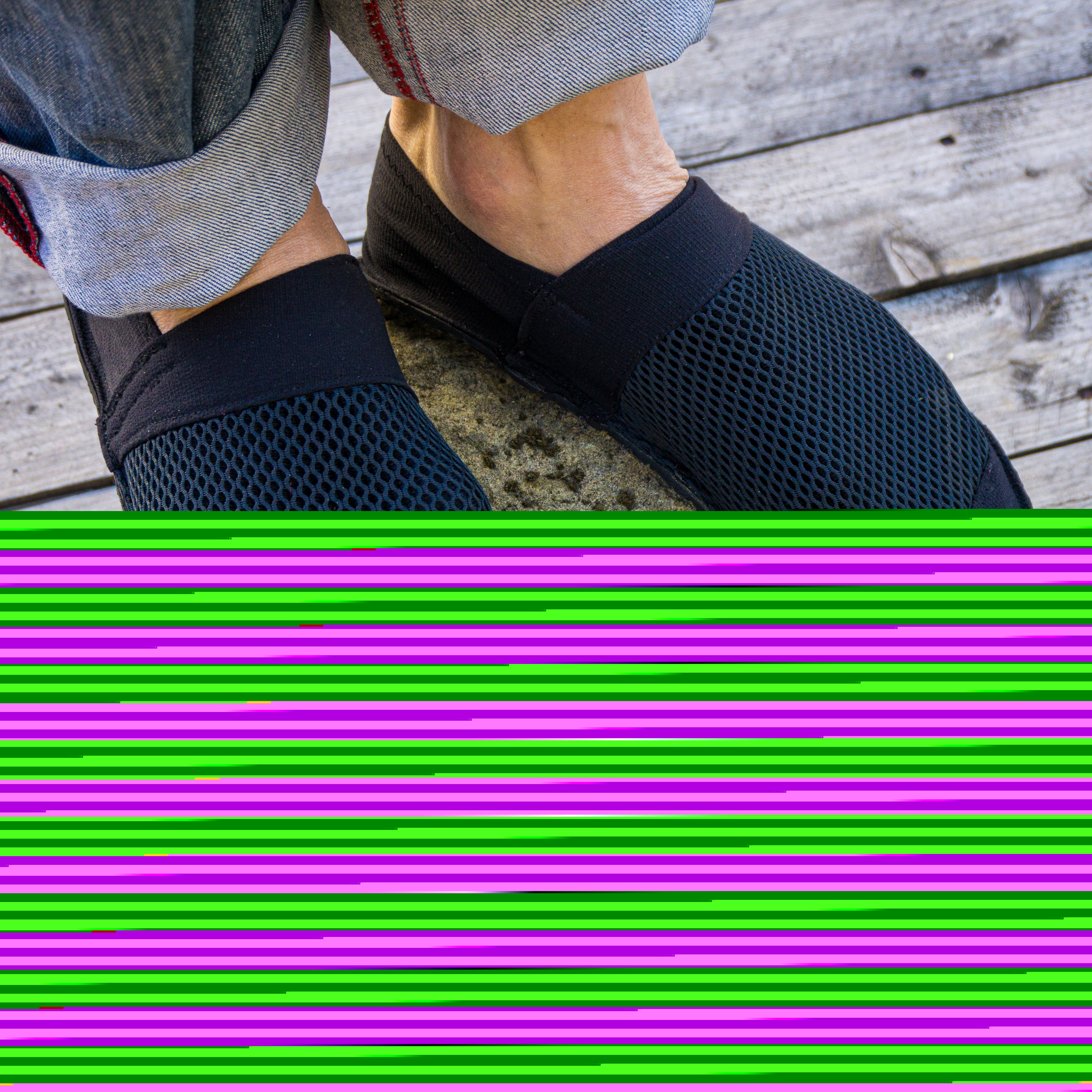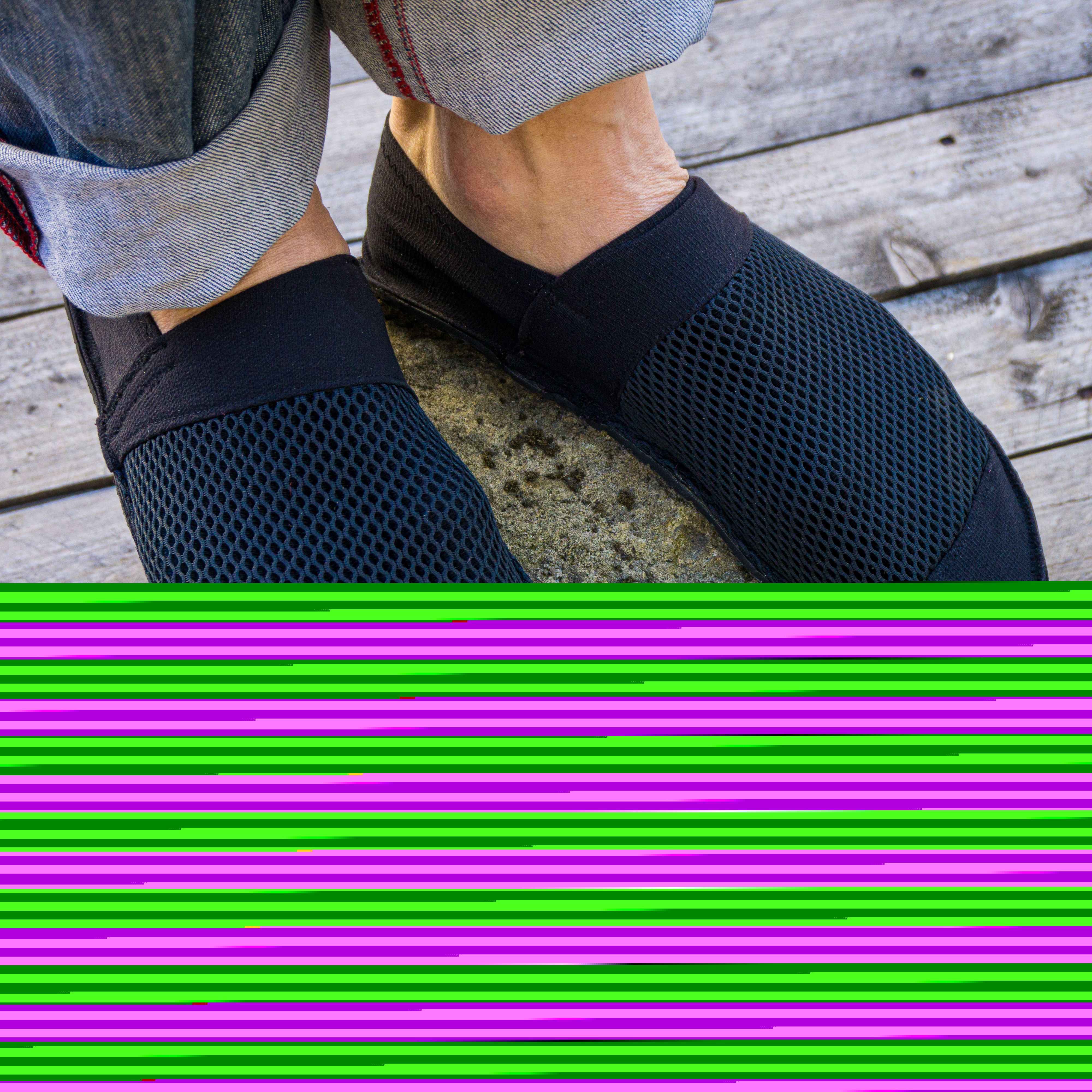 Barfußschuhe, ähnlich wie Espandrillos (nur in der High-Tech-Ausführung). Die weiche, dünne Supernewflex-Sohle ist perfekt für rutschfeste Schuhe mit minimaler Dämpfung. Das Stretch-Polyamid und das 3D-Netz werden zum Oberstoff zusammengenäht (also Oberstoff kann natürlich auch nur das 3D-Netz oder ein robuster, elastischer Stoff verwendet werden). Dieses wird danach auf die weiche, hautsympatische Alcantara Zwischensohle genäht. Diese Sohle wird dann flächig auf die Sohlenplatte geklebt, die danach zugeschnitten wird. So muss nicht durch die Sohlenplatte genäht werden. Die Bestandteile können natürlich gegen andere, ähnliche Artikel austgetauschet werden. Aber diese Kombination ist unser Favorit.