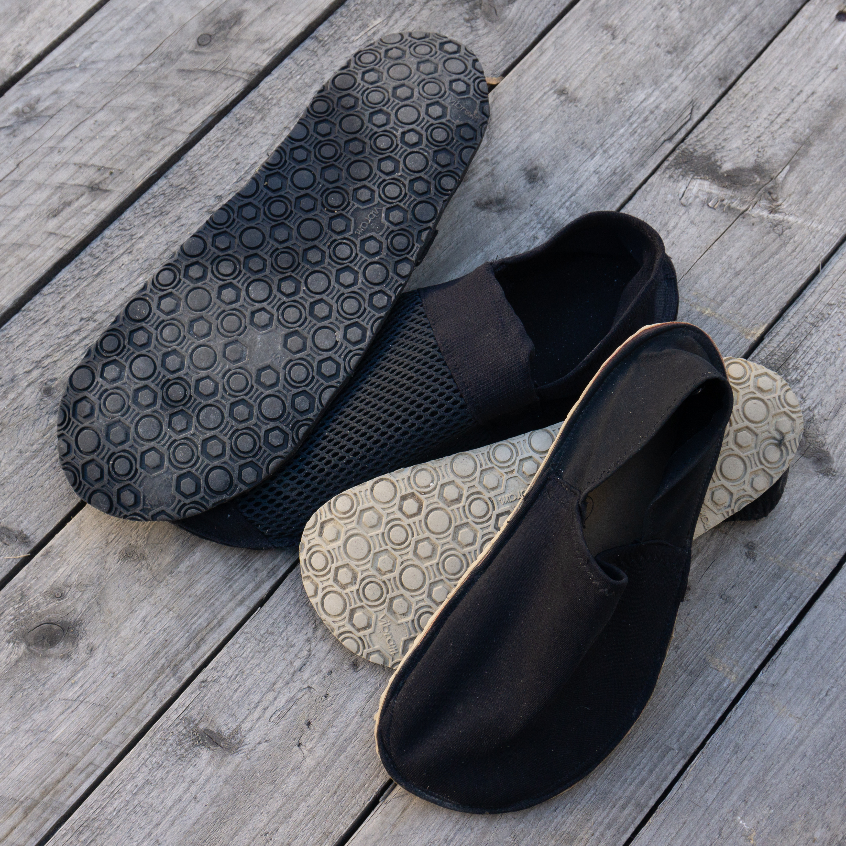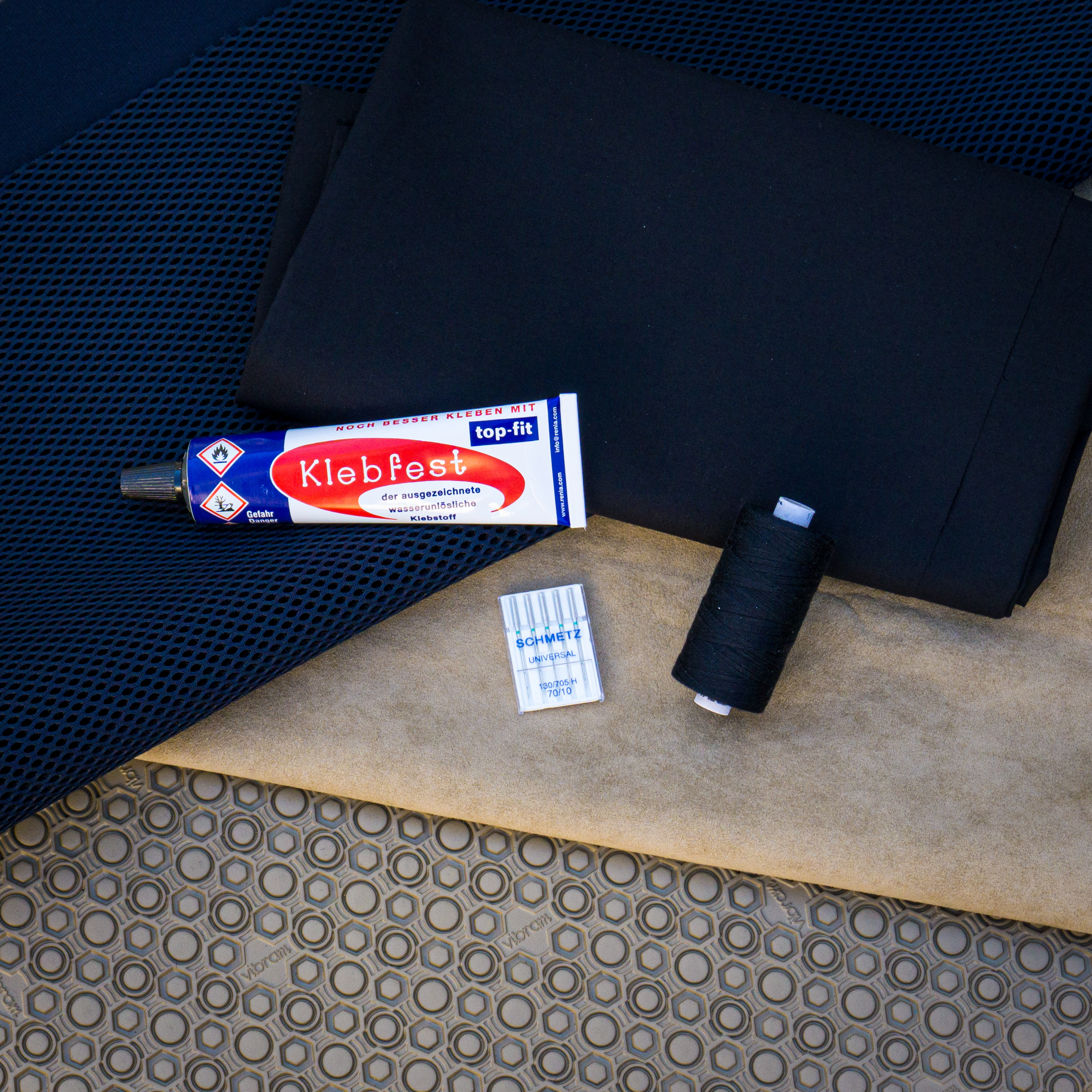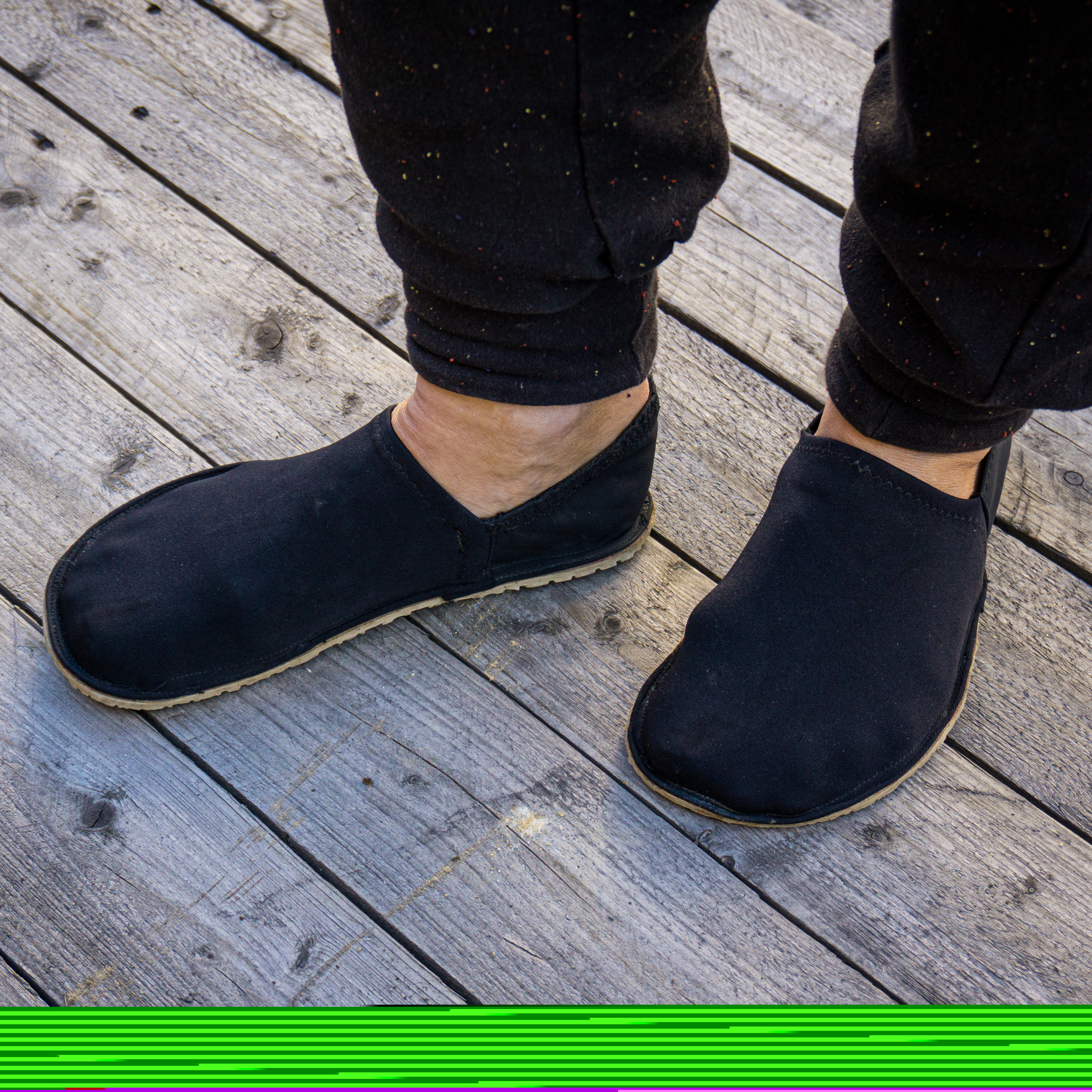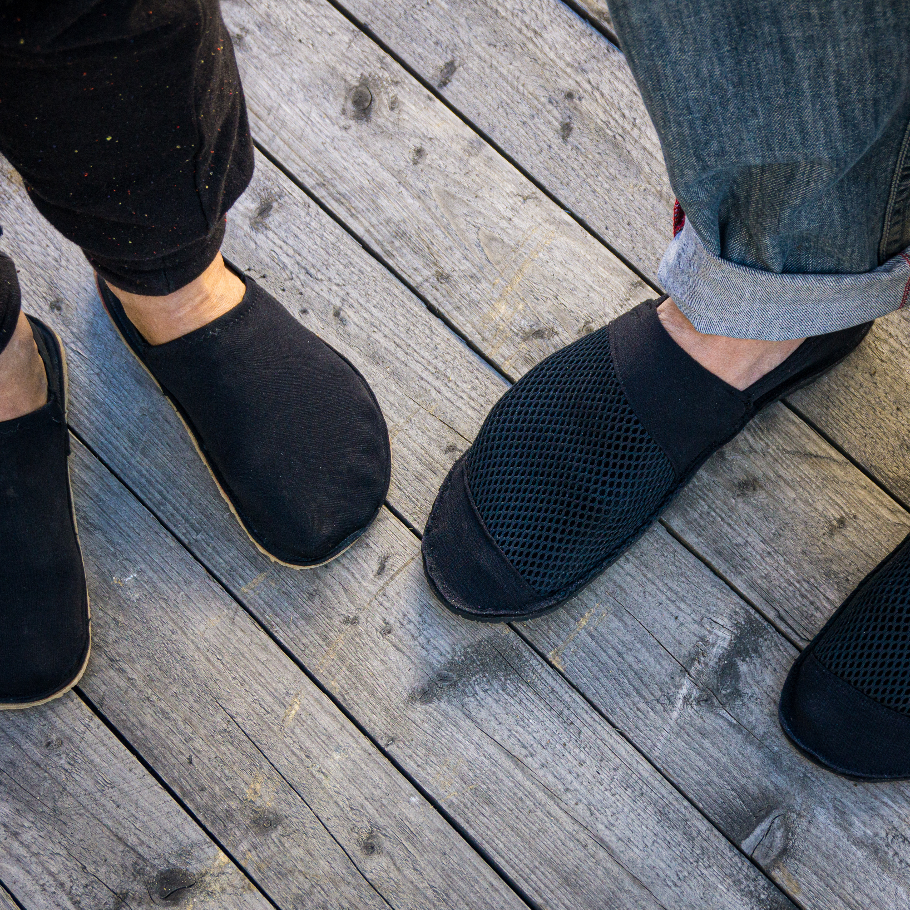 Barfußschuhe, ähnlich wie Espandrillos (nur in der High-Tech-Ausführung). Die weiche, dünne Supernewflex-Sohle ist perfekt für rutschfeste Schuhe mit minimaler Dämpfung. Das Stretch-Polyamid und das 3D-Netz werden zum Oberstoff zusammengenäht (also Oberstoff kann natürlich auch nur das 3D-Netz oder ein robuster, elastischer Stoff verwendet werden). Dieses wird danach auf die weiche, hautsympatische Alcantara Zwischensohle genäht. Diese Sohle wird dann flächig auf die Sohlenplatte geklebt, die danach zugeschnitten wird. So muss nicht durch die Sohlenplatte genäht werden. Die Bestandteile können natürlich gegen andere, ähnliche Artikel austgetauschet werden. Aber diese Kombination ist unser Favorit.